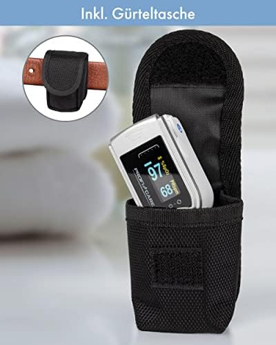 Das Fingersauerstoffmessgerät wird mit einer praktischen Gürteltasche geliefert. Betrieb mit 2 x 1,5 V (AAA) Batterien (Batterien nicht im Lieferumfang enthalten)